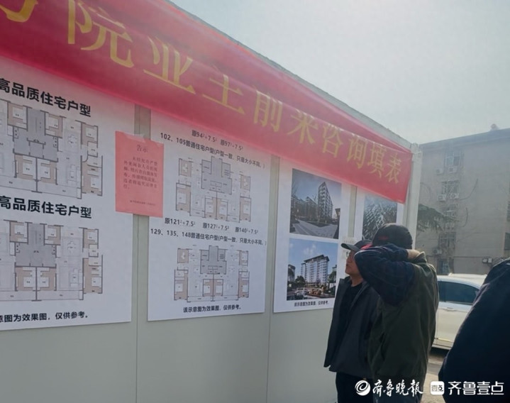 3月25日下昼,记者来到舜耕路38号院。小区广场上支起一处临时板房,挂着“38号院旧址翻新形状筹建处”的牌子。板房外张贴着多张户型图与形状建成后的服从暗意图,经常有居民前来递交宗旨搜集表,也有东谈主围着户型图存身巡逻、交流斟酌。