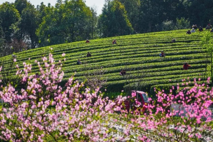 3月4日,綦江区石角镇新农村茶园迎来首批春茶采摘,茶农们穿梭于茶垄间采摘春茶。通信员陈星宇摄/视觉重庆
