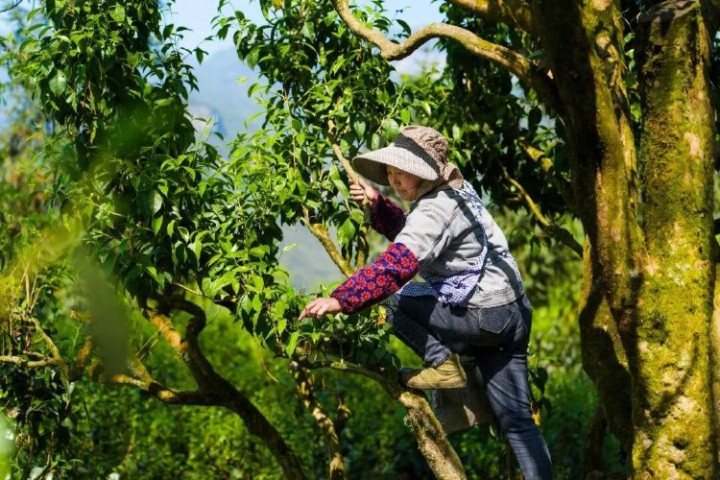 2025年4月18日,南川区德隆镇茶树村,茶农在树上采摘大树茶茶叶。记者李雨恒摄/视觉重庆