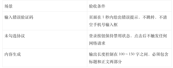 与其形色”理念念输出是什么样的”,不如列举”哪些输出是不可罗致的”。在写验收层之前,先问我方:AI在这个需求里最可能犯哪几个错?然后把这些古怪写成回绝条目。比正向形色更精确,也更容易平直升沉成测试用例。