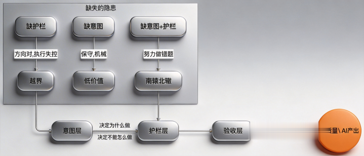三层的配合商量,一句话评释晰:意图层决定它为什么作念→护栏层决定它不可如何作念→验收层决定它作念到什么才算简直作念对