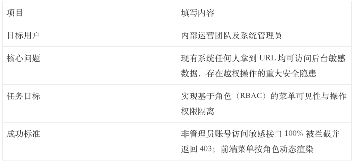 为每个独建功能新建一个Markdown门径的PRD文献(如feature_role_auth.md),内部只写该模块的”意图层”和”验收层(BadCase)”。