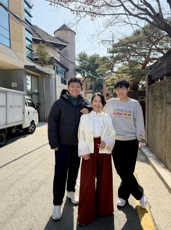 本年3月,姜甲儒(右一)和哥哥带姆妈去韩国旅行。受访者供图