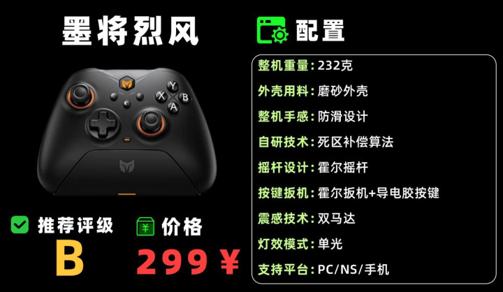 收受 TMR 霍尔摇杆,提拔热插拔与力度转机,ABXY 为光轴按键,寿命较长;扳机是霍尔 + 微动双切换,四马达提拔扳机振动,有线 1000Hz 讲述率,机身磨砂塑料,作念工中规中矩。