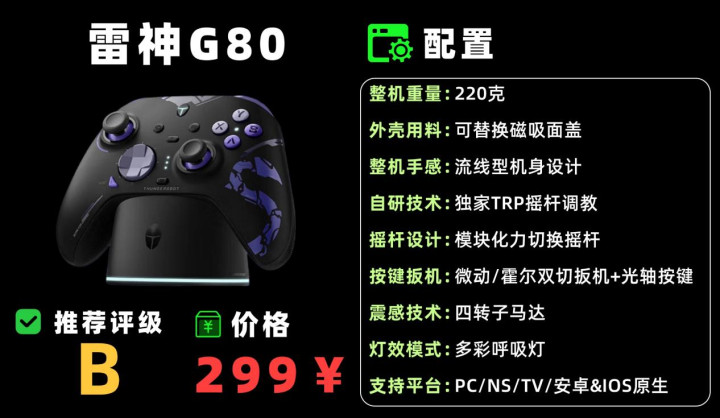 标配磁吸面盖、替换摇杆 / 十字键及充电底座,提拔六轴体感与宏编程。操控精确度够用,振动反馈档次一般,永劫刻握持偏宽,小手需得当。