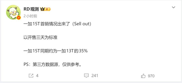 博主“RD不雅测”近期发布了一加15T的首销数据(开售三天),这份数据(非官方)贯通,一加15T的首销同时销量,约为一加13T的35%。也即是加价之后,首销的销量仅为上代的1/3摆布。