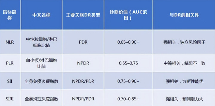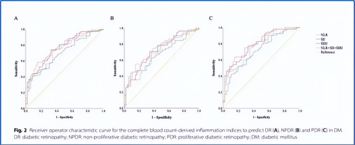 一项横断面与纵向计议评估了中性粒细胞-淋巴细胞比值、全身免疫炎症指数与全身炎症反应指数在DR会诊及预后预测中的价值。计议对基线无DR的糖尿病患者进行2年随访,纳入479名参与者,92名(19.2%)在2年内新发DR。主要计议为:中性粒细胞与淋巴细胞比值(NLR)、血小板×中性粒细胞/淋巴细胞比值(SII)、中性粒细胞×单核细胞/淋巴细胞比值(SIRI)。