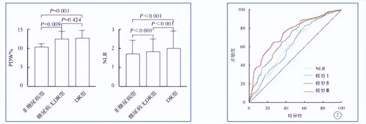 与非DM组、有DM无DR比较,DR组PDW、NLR呈飞腾趋势。