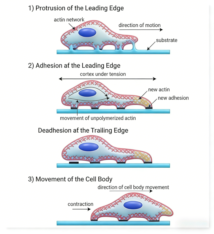 细胞迁徙是一个高度配合的多设施轮回流程。率先,细胞在趋化因子或基质硬度梯度作用下发生极化,建设前后轴。随后,通过肌动卵白团员驱动,细胞前沿伸出片状伪足或丝状伪足。这些突起结构通过前述的整合素介导,与ECM树立新的粘附点,酿成牵引支点。接着,在肌球卵白II的作用下,细胞胞体收缩,产生前向推力。临了,细胞尾部粘附解离,细胞全体上前移动。这一轮回的执续进行,小九体育在线直播官网平台组成了细胞迁徙的基本物理模子。
