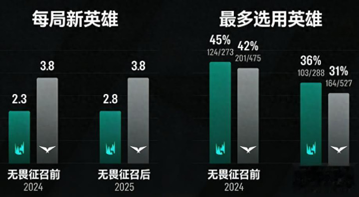 阿谁万众期待的数据贪图果真莫得变化。在LCK,每3.8场比赛才有一位新豪杰登场——2024年与2025年完全一致。LEC的数据也相通:两年间均为每2.3场比赛一位新豪杰。丧胆征召并未带来豪杰弃取上的百花都放。它仅仅让相似的豪杰从头分散,况兼莫得任何豪杰能像以前那样占据全都总揽地位:2024年全球总决赛中采选次数最多的豪杰共出场48次;而到了2025年,这个数字降到了27次。