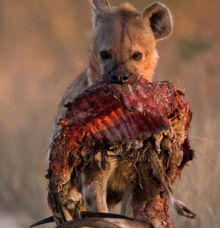 猎物的后腰、臀部、肛门周围,是视觉盲区,莫得骨骼保护,肌肉和内脏径直涌现在皮肤底下。斑鬣狗追上猎物之后,方针不是脖子,是这里。