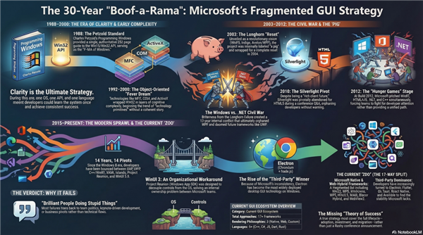 Snover指出,夙昔14年间,微软在推选WindowsGUI框架方面转向了14次,如今的Windows平台上共存着17种GUI时间,粉饰5种编程谈话: