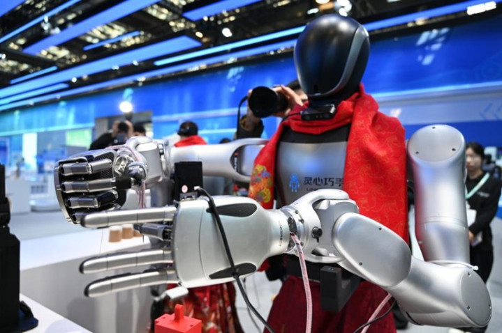 图为领有灵巧手的机器东谈主正在穿针引钱。(陈菲摄)