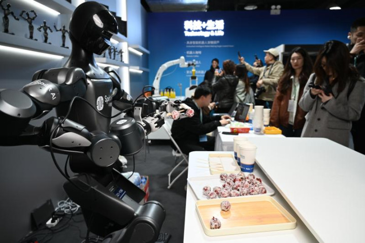 在中关村外洋翻新中心,全新亮相的机器东谈主餐吧将北京传统小吃融入轻餐饮场景,多个品牌的机器东谈主通过长入疗养平台,竣事从点餐、制作到送餐的全经过自主协同功课。站在后厨的具身智能机器东谈主正在饰演穿糖葫芦,它攻克了“柔性物体操作难”的行业痛点,可双臂协同精确完成穿签的长经过复杂任务。此外,再次亮相的茶艺机器东谈主,可模拟煮茶众人手法,为参会的客东谈主提供方便、贞洁的用茶体验。机器东谈主乐队与跳舞机器东谈主携手献上精彩的饰演,整皆齐整的舞步、精确到位的节律感,引得在场记者连连咋舌。