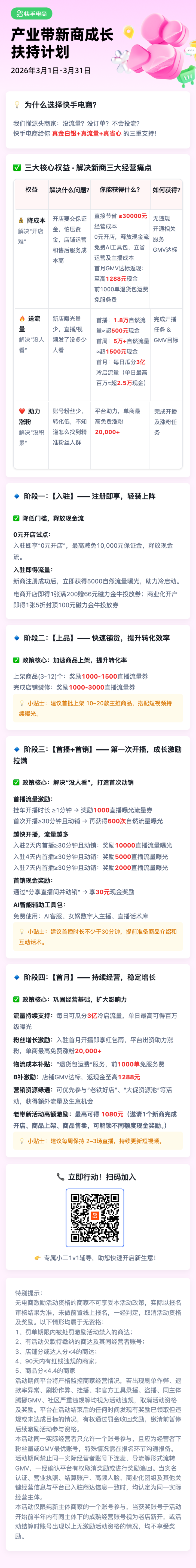 日前,快手电商发布2026年产业带新商成长扶捏贪图,针对新商在冷初始、捏续成长、深度策动等方面的策动诉求,围绕“降资本、送流量、助力涨粉”三大盘算,联想了粉饰流量、返现、资源、劳动四大维度的系统性激勉机制。